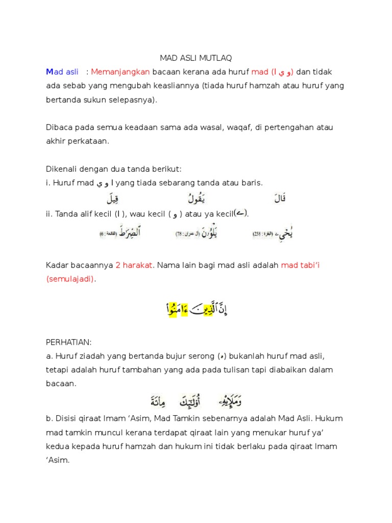 Mad paling asas ialah Mad Tabie atau Mad Asli مد طبيعي أصلي yang secara harfiahnya bermaksud normal seperti biasa. Nama lain dari mad asli adalah. Violate Them at Your.